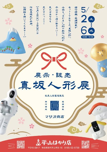精巧で愛嬌満載がモットーの「真坂人形」が平山はかり店に勢ぞろいします。